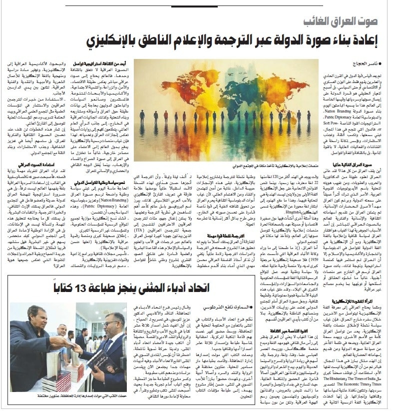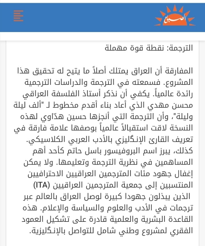 المفارقة أن العراق يمتلك أصلاً ما يتيح له تحقيق هذا المشروع. فسمعته في الترجمة والدراسات الترجمية رائدة عالمياً. يكفي أن نذكر أستاذ الفلسفة العراقي محسن مهدي الذي أعاد بناء أقدم مخطوط لـ “ألف ليلة وليلة”، وأن الترجمة التي أنجزها حسين هدّاوي لهذه النسخة لاقت استقبالاً عالمياً بوصفها علامة فارقة في تعريف القارئ الإنـﮕليزي بالأدب العربي الكلاسيكي. كذلك، يبرز اسم البروفيسور باسل حاتم كأحد أهم المساهمين في نظرية الترجمة وتعليمها. ولا يمكن إغفال جهود مئات المترجمين العراقيين الاحترافيين المنتسبين إلى جمعية المترجمين العراقيين (ITA) الذين يبذلون جهودا كبيرة لوصل العراق بالعالم عبر ترجمات في الأدب والعلوم والسياسة والإعلام. هذه القاعدة البشرية والعلمية قادرة على تشكيل العمود الفقري لمشروع وطني شامل للتواصل بالإنـﮕليزية.