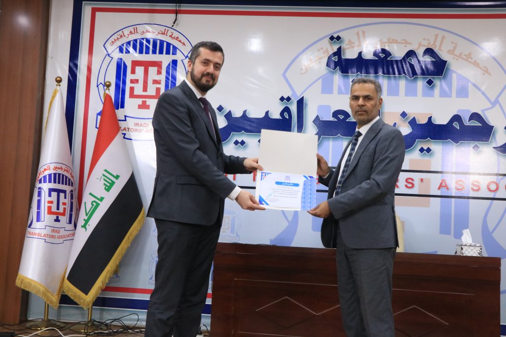 وقدم الاستاذ كاظم عبد الحسن رئيس الجمعية شهادة شكر وتقدير الى الدكتور ابراهيم طلعت ابراهيم تثميناً لجهوده في القاء الندوة .
